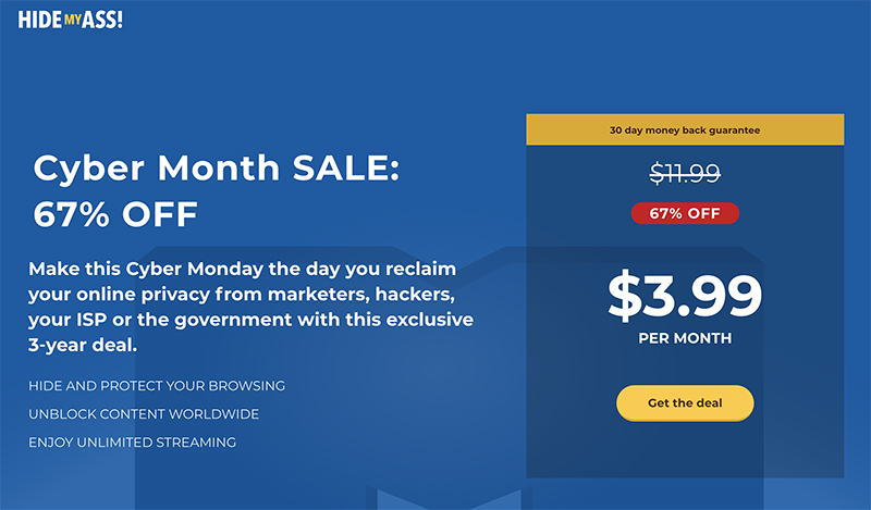 For Black Friday and Cyber Monday, Hide My Ass has announced a 67% discount, but to avail that you will have to commit to a three-year plan. You can also choose the six-months plan, which will help you earn a 33% discount.