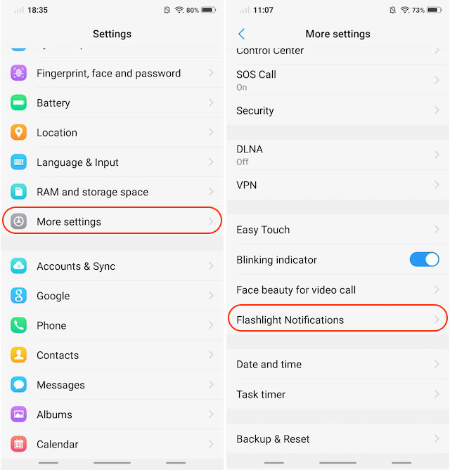 To enable this feature, go to Settings -> More Settings -> Flashlight Notifications and enable it.