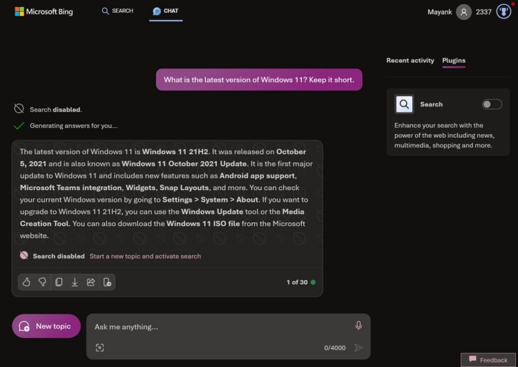 Basically, by enabling this upcoming offline mode, users can get to use the AI directly. Then, it can answer your questions without ever searching the internet for information. The testing revealed that Bing Chat works much faster when the search integration feature is turned off. However, it does give more outdated information for certain queries. Windows Latest theorizes that Microsoft may be using a combination of GPT 3.5 & GPT 4 here. When the AI was asked about the version of ChatGPT it is using, it refused to answer, saying that it is “not allowed to discuss anything about my training data”.