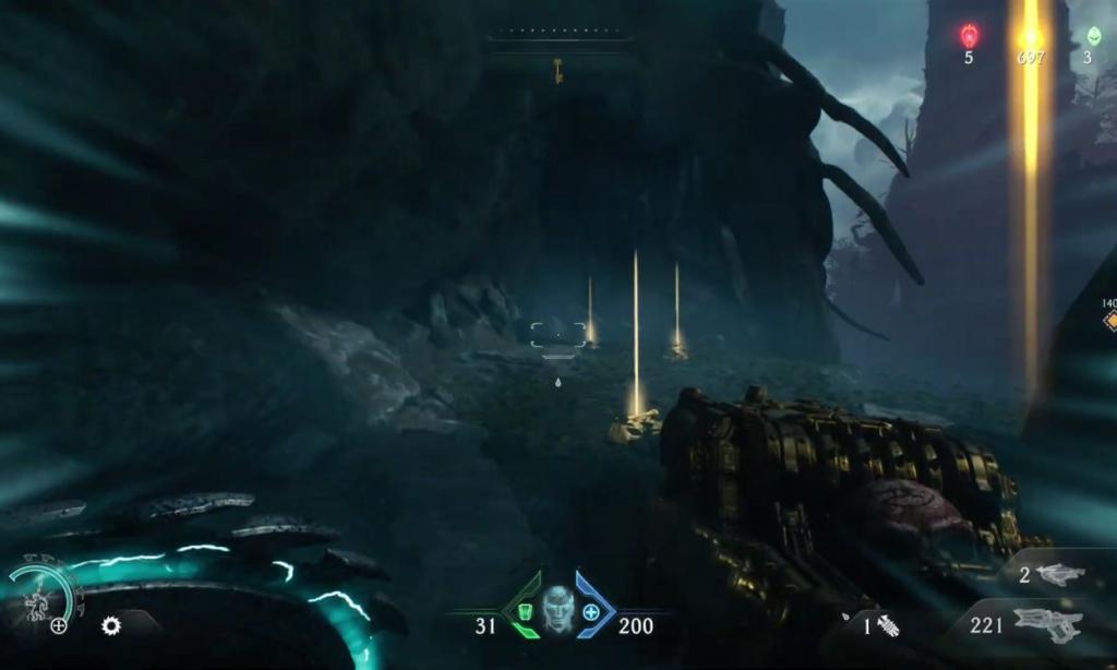 While following the main objective, you’ll come across an open area with a central pillar wrangled by a gore-tentacle. Once you’re here, turn left, pace forward, and jump onto the lower level. Now, jump across the gap and follow the trail of gold pick-ups to the secret area.