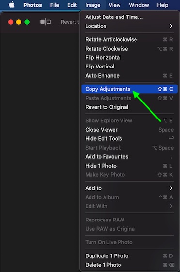 3. Next up, select the Image menu and click on Paste Adjustments. Besides, you can also control-click an item in the editing view and select Copy Adjustments or Paste Adjustments.