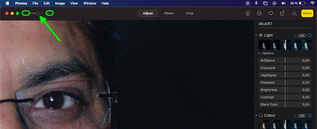Photos app has got an impressive set of adjustment tools to let you fine-tune several crucial things like exposure, brightness, color, black and white, and more. To get going, click on the Adjust button at the top center.