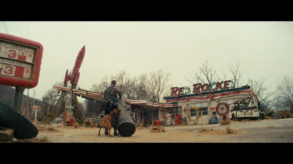 In the TV show, the squire Thaddeus reaches the Red Rocket pit stop. This is a prominent location in Fallout 4, where players park their power armor for repairs and meet Dogmeat, the dog.