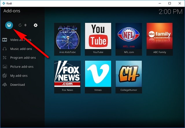 - To install SuperRepo addons, go back to the Main Menu and click on Addons on the left pane. You’ll get to the following screen, on which, you’ll need to click on the Addons icon on the top-left corner as shown in the image below.