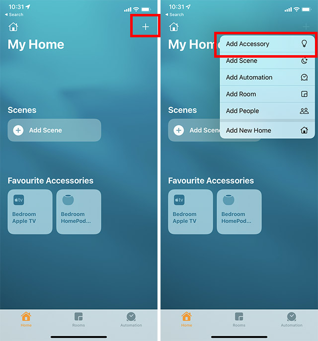 - Open the ‘Home’ app on your iPhone and tap on the ‘+’ button on the top-right. Here, tap on ‘Add Accessory‘.