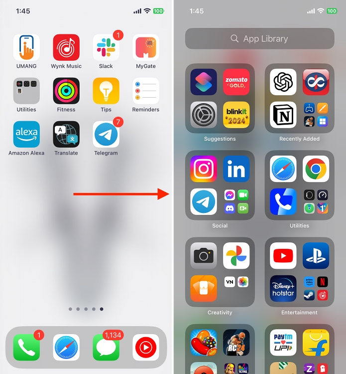 Accessing the app library on your iPhone or iPad is pretty easy. Simply swipe left across all the home screens on your iPhone, and you will find yourself in this organized haven of apps – App Library.