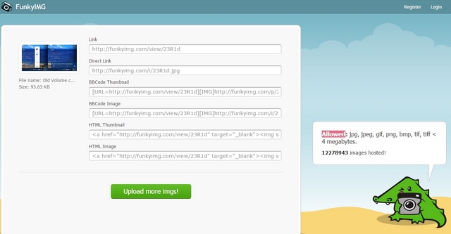 FunkyIMG is a pretty simple image-hosting website and unlike its name, there’s nothing funky about it. It lets you upload images with drag & drop or you can choose to browse and select an image. Your images load up quickly and you get various links and embedding codes for your picture. It’s pretty simple and that works for it.