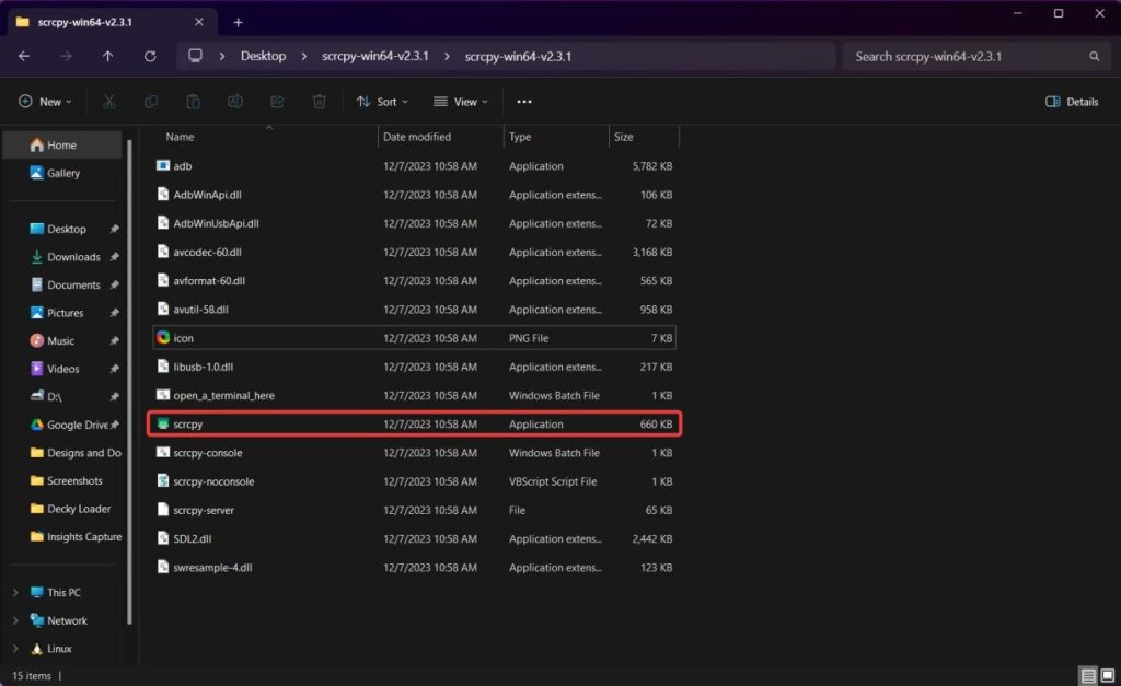 4. Go to the Scrcpy folder that we extracted before and double-click on the Scrcpy.exe file to open it.