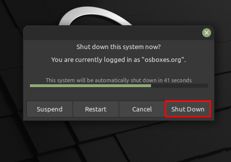 3. This will option a new dialogue box with the buttons named Suspend, Restart, and Shutdown. Click on the Shutdown button to finally shutdown the Linux system. If you do not select any option, the system will automatically shutdown in the next 60 seconds.
