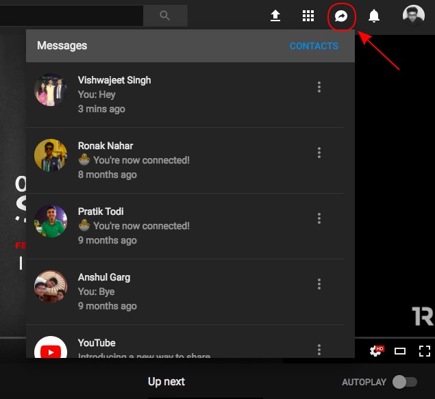 Now when you visit YouTube from your laptop or desktop computer, you will notice a new ‘chat bubble’ icon on the right of the top header sitting between the notification bell and apps icon. This opens up the messages window, which shows you the contacts you’ve sent any videos or messages from within YouTube itself. Yes, it is synced with the app in real-time and works just like any other messaging service with separate web and mobile apps.